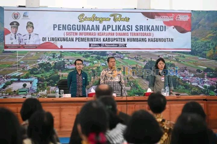 HUMBAHAS – Bupati Humbang Hasundutan, Dr. Oloan Paniaran Nababan, SH, MH yang diwakili Asisten Administrasi Umum Jaulim Simanullang membuka Bimbingan Teknis (Bimtek) Penggunaan Aplikasi Sistem Informasi Kearsipan Dinamis Terintegrasi (Srikandi) sebagai langkah percepatan transformasi digital dalam pengelolaan kearsipan di lingkungan Pemerintah Kabupaten Humbang Hasundutan yang dilaksanakan di Aula Hutamas, Kamis 27 Nopember 2025.