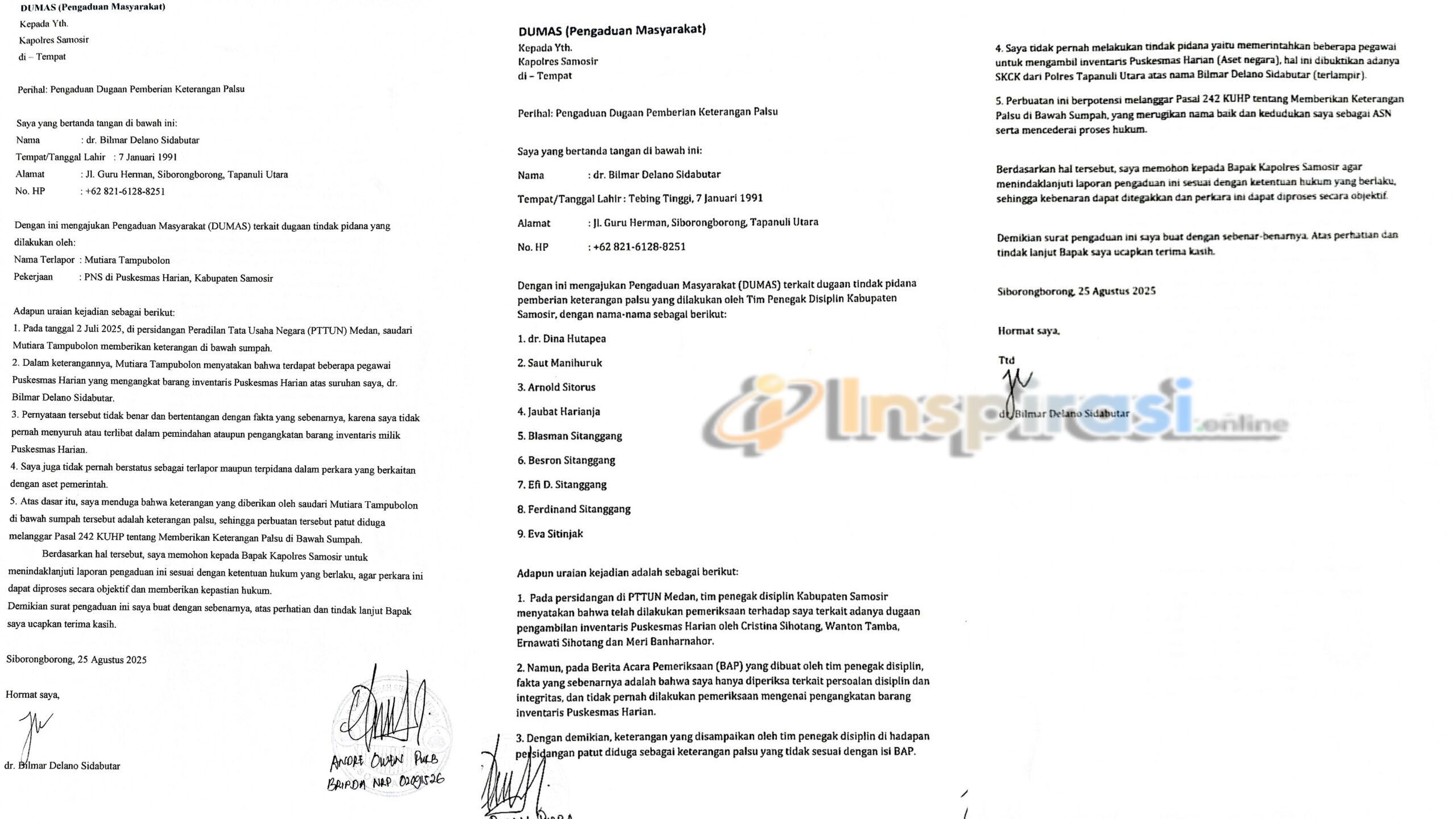 Laporan kedua ditujukan kepada Tim Penegak Disiplin ASN Kabupaten Samosir, yang terdiri dari sembilan pejabat di antaranya dr. Dina Hutapea, Saut Manihuruk, Arnold Sitorus, Jaubat Harianja, Blasman Sitanggang, Besron Sitanggang, Efi D. Sitanggang, Ferdinan Sitanggang dan Eva Sitinjak, Mereka diduga memberikan keterangan tidak benar dalam pemeriksaan administratif yang kemudian melahirkan SK Bupati Samosir Nomor 233 Tahun 2024 tentang Pemberhentian dengan Hormat Tidak Atas Permintaan Sendiri terhadap dr. Bilmar Delano Sidabutar.